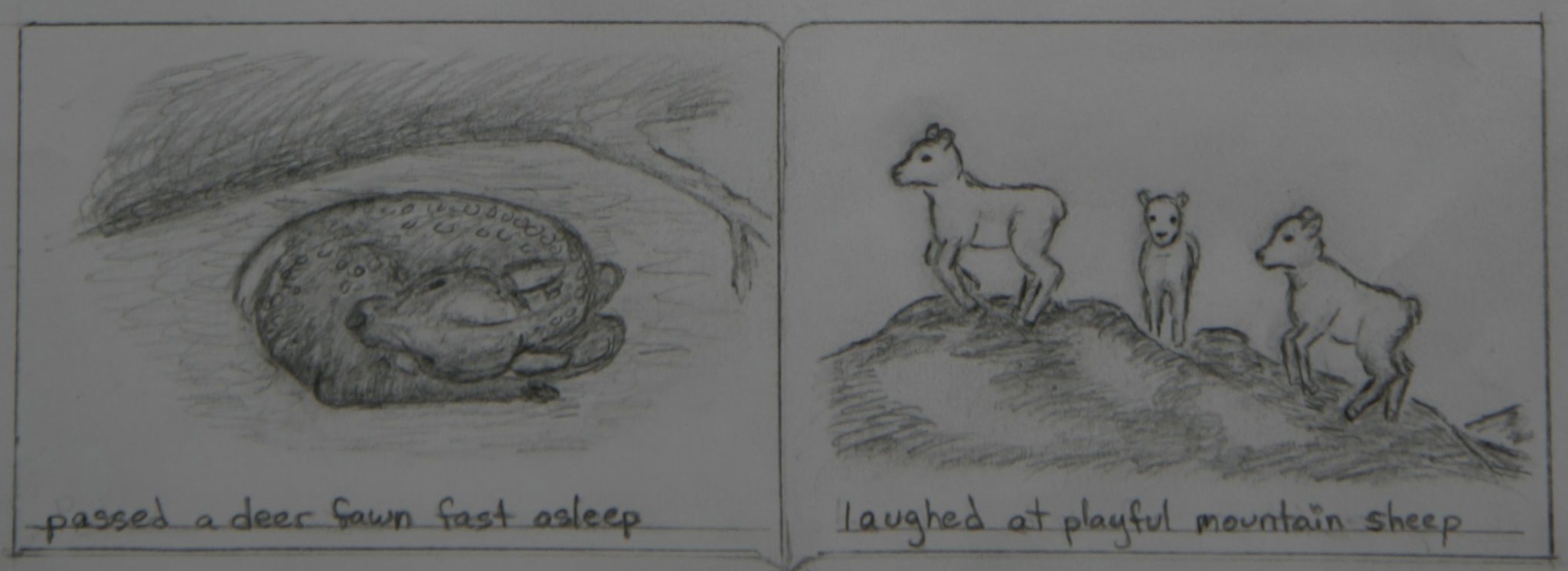 passed a deer fawn, fast asleep laughed at playful mountain sheep